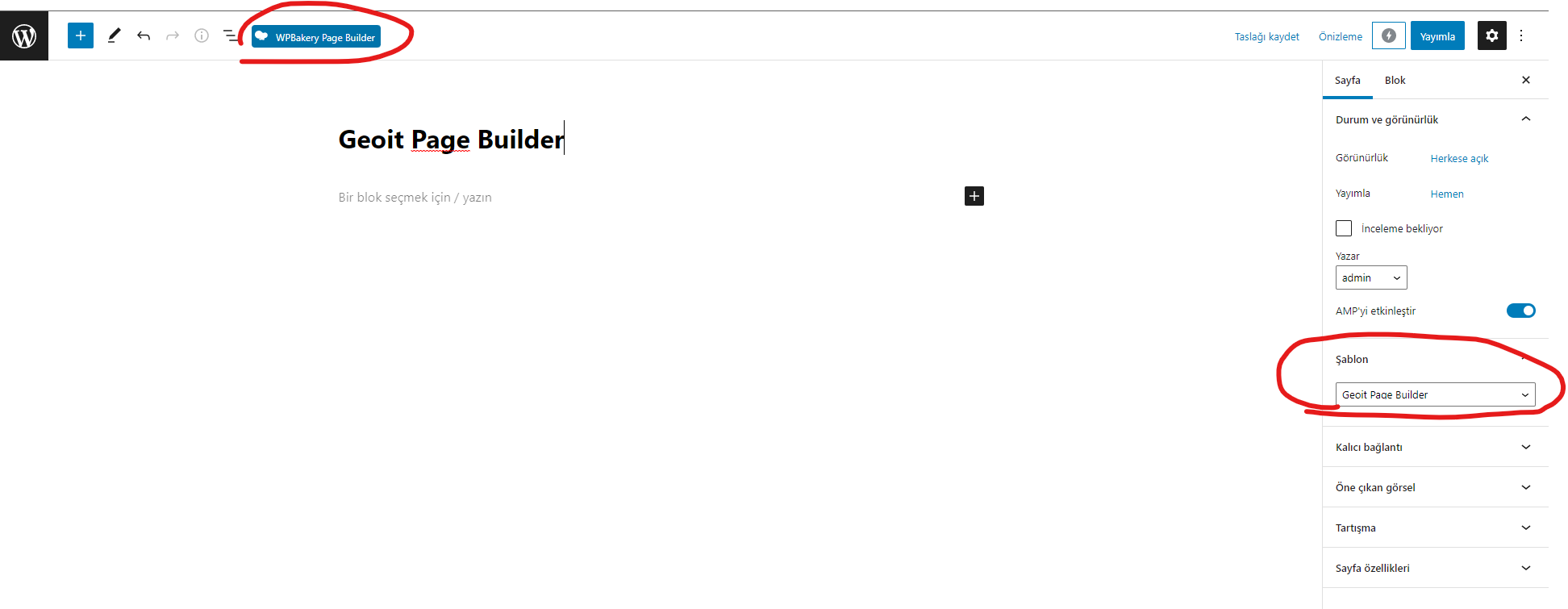- Sağ paneldeki Şablon kısmını açın ve Geoit Page Builder şablonunu seçip sayfayı yayınlayın veya taslağa kaydedin.
