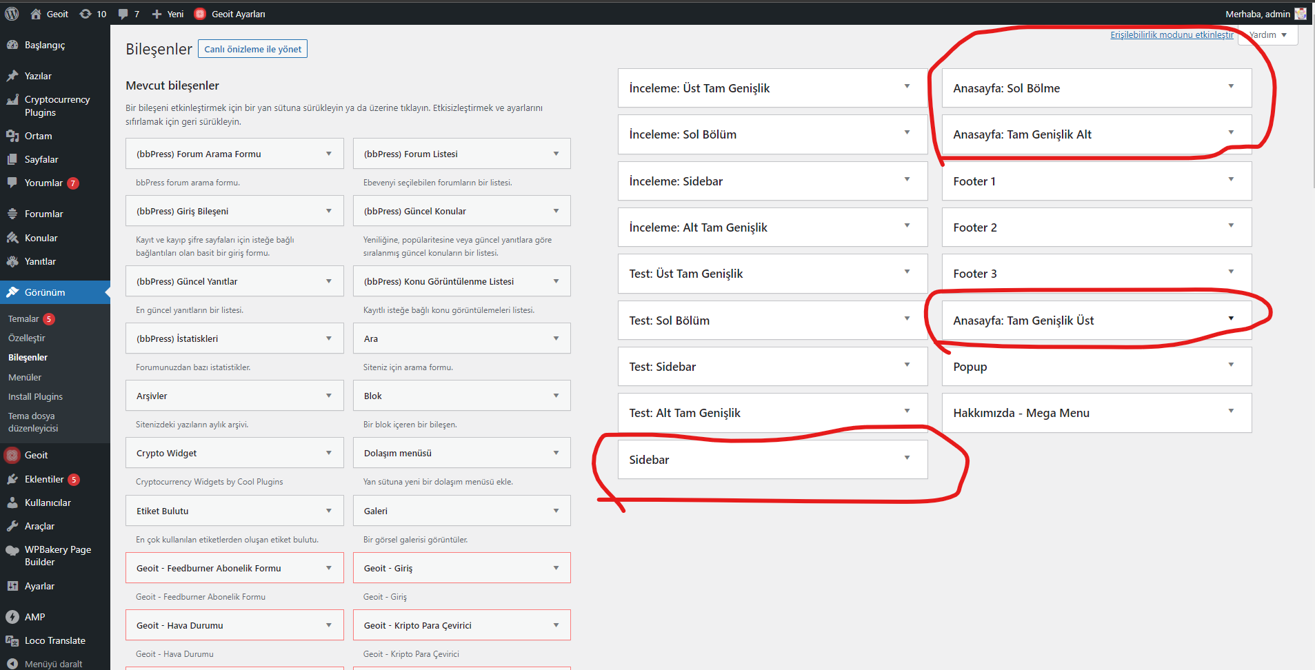 - Anasayfada gözükecek olanlar: Anasayfa: Tam Genişlik Üst, Anasayfa: Tam Genişlik Alt, Anasayfa: Sol Bölme ve Sidebar.