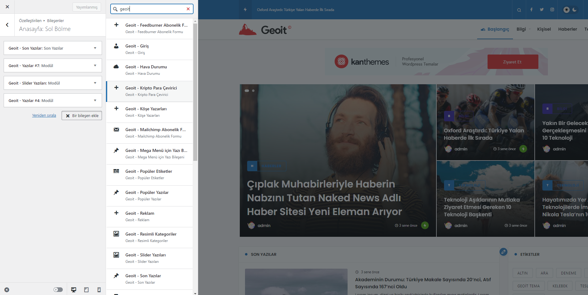 - Oluşturduğunuz sayfanın bileşen alanlarına (örn. Son Dakika: Sol Bölüm) gözükmesini istediğiniz bileşenleri ekleyip özelleştirmelerini yapabilirsiniz.