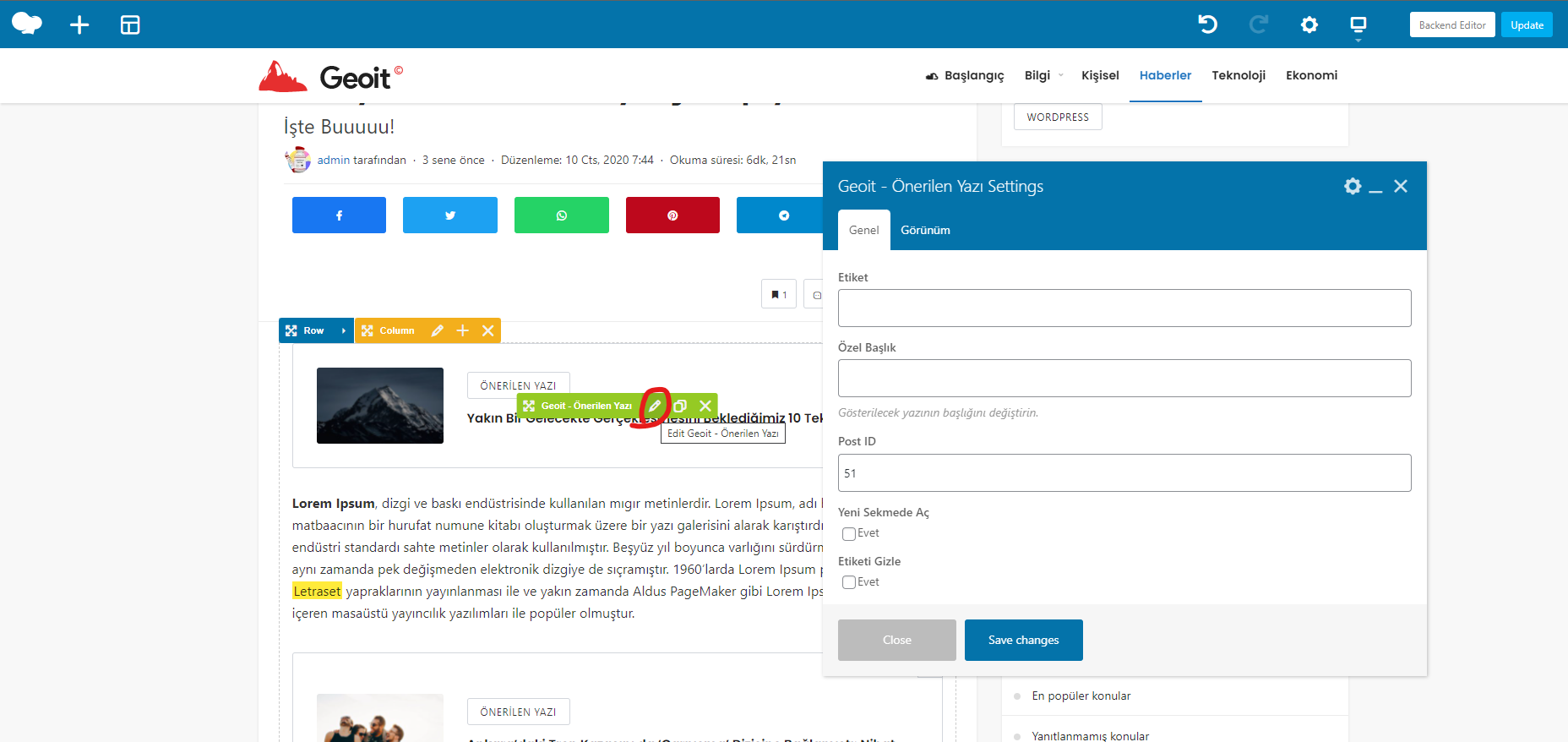 - Sağ kısımda modülün ayarlarını görebilirsiniz. Ayar kısmını tekrar açmak istiyorsanız modülün üzerine geldikten sonra Düzenle butonuna tıklayabilirsiniz.